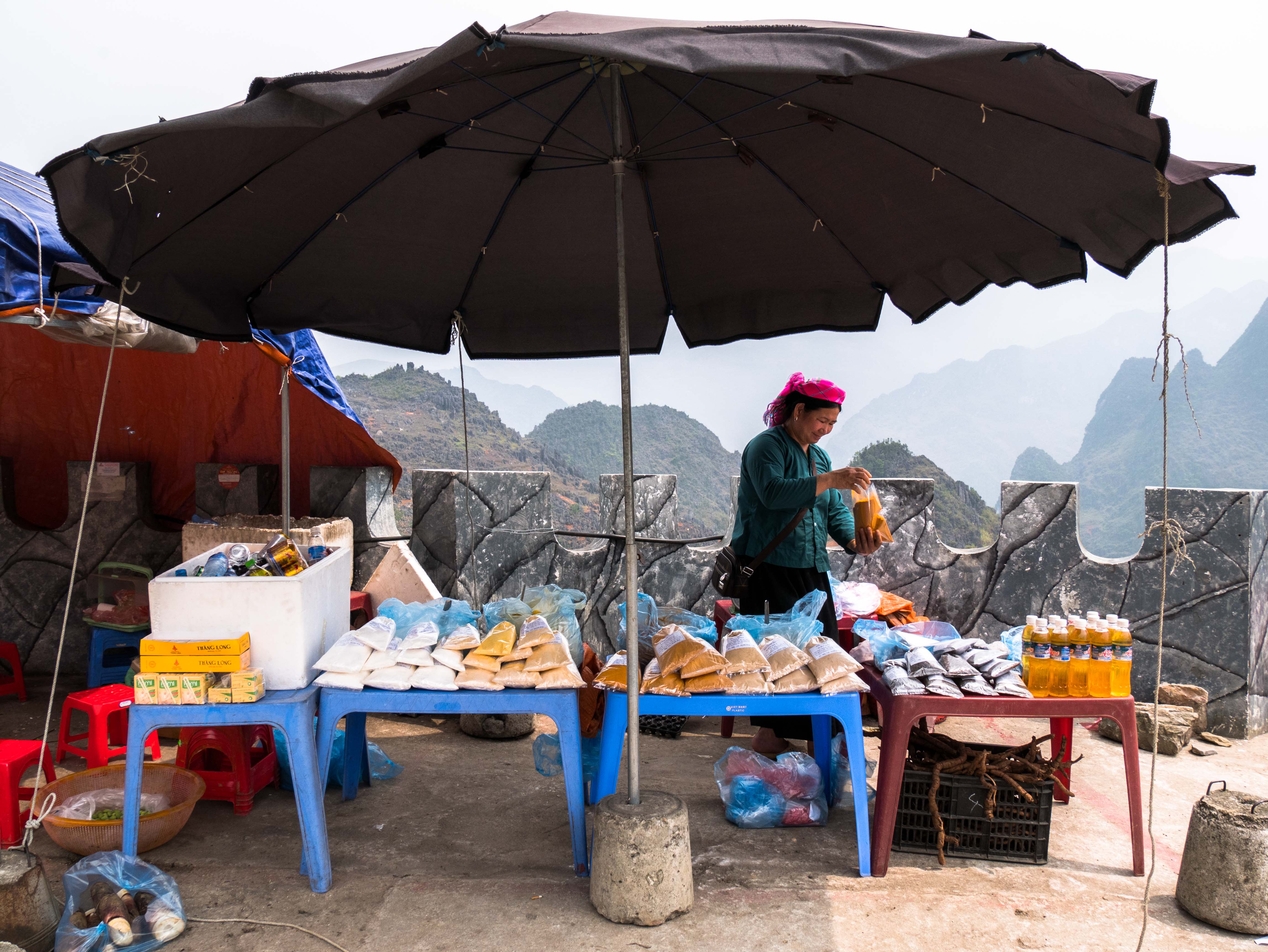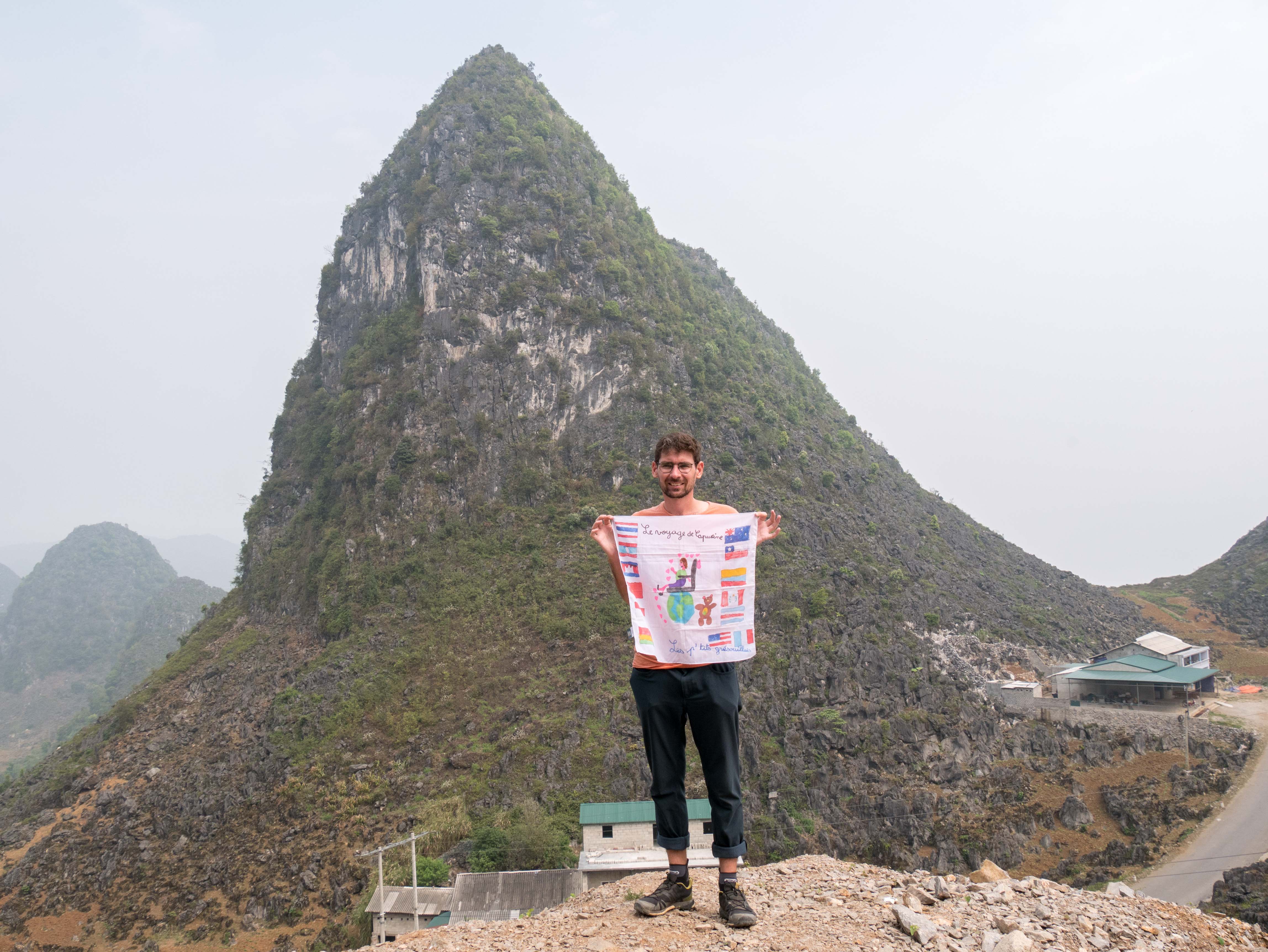 Nous arrivons à Lung Cu et voyons au loin, sur le sommet d’une des plus haute montagne, un drapeau gigantesque du Vietnam flotter au vent. Si nous pensons que nous ne sommes rien dans ce monde, ce bout de drap démesuré me rappelle que nous tentons pourtant d’exister par tous les moyens !