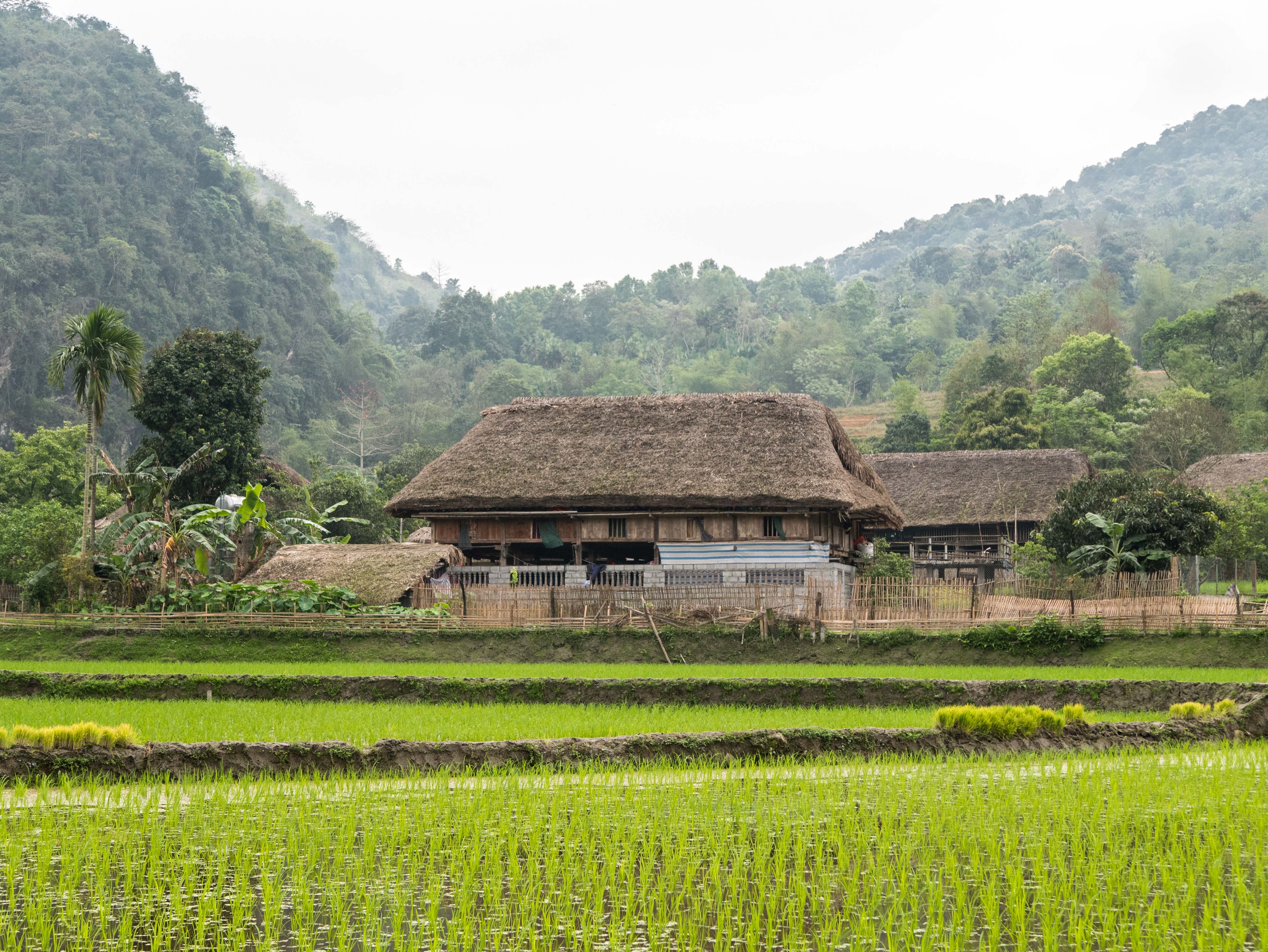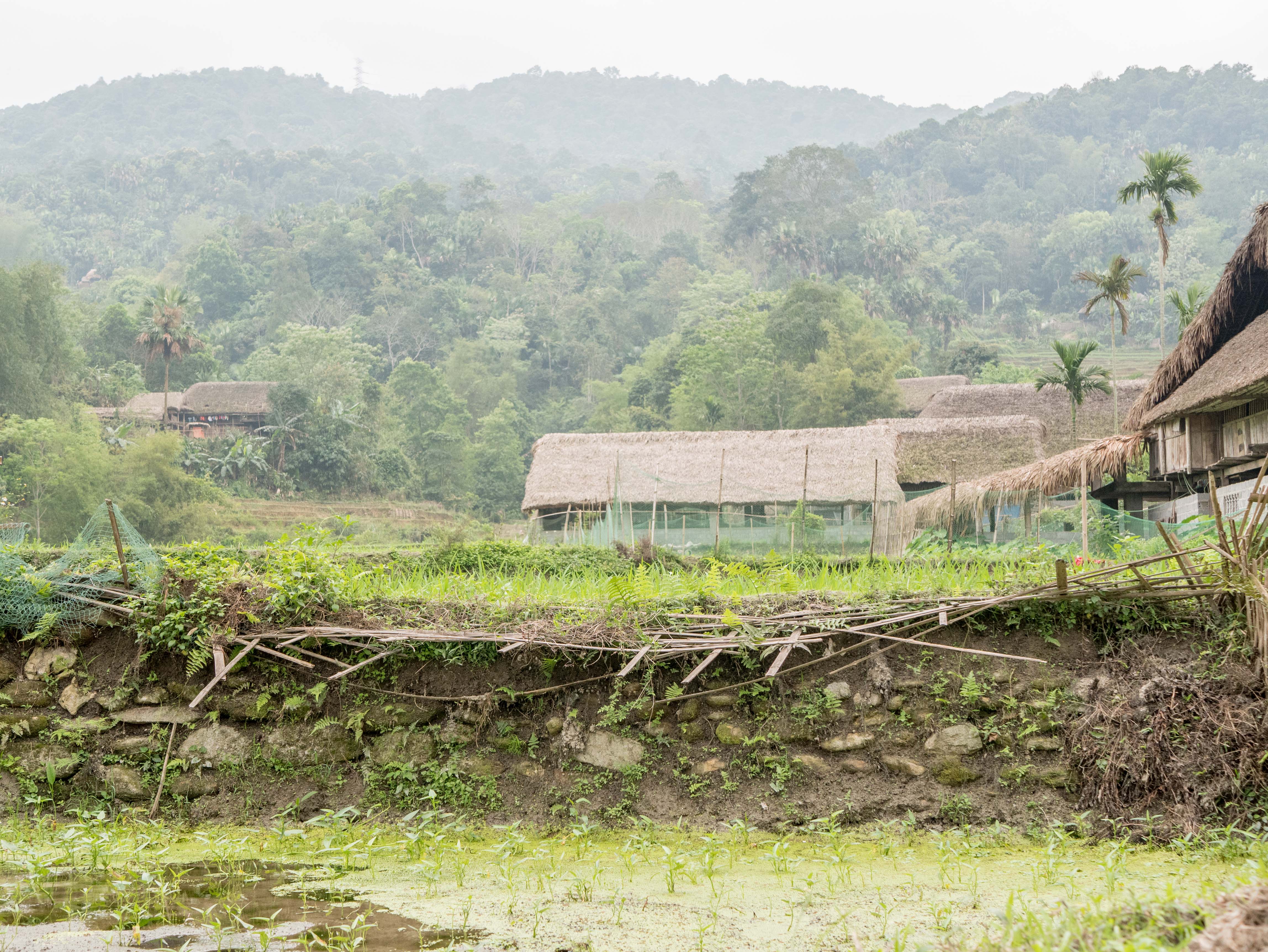 Le village est construit à flanc de montagne. Il m’est difficile de le traverser en vélo et je finis par le laisser sur un côté afin de monter un peu plus dans la montagne. En bas, des bassines artificiels bordent des maisons pour la plupart en bois et avec des toits en paille. Ces bassins abritent des élevages de poissons destinés à être vendus au marché.