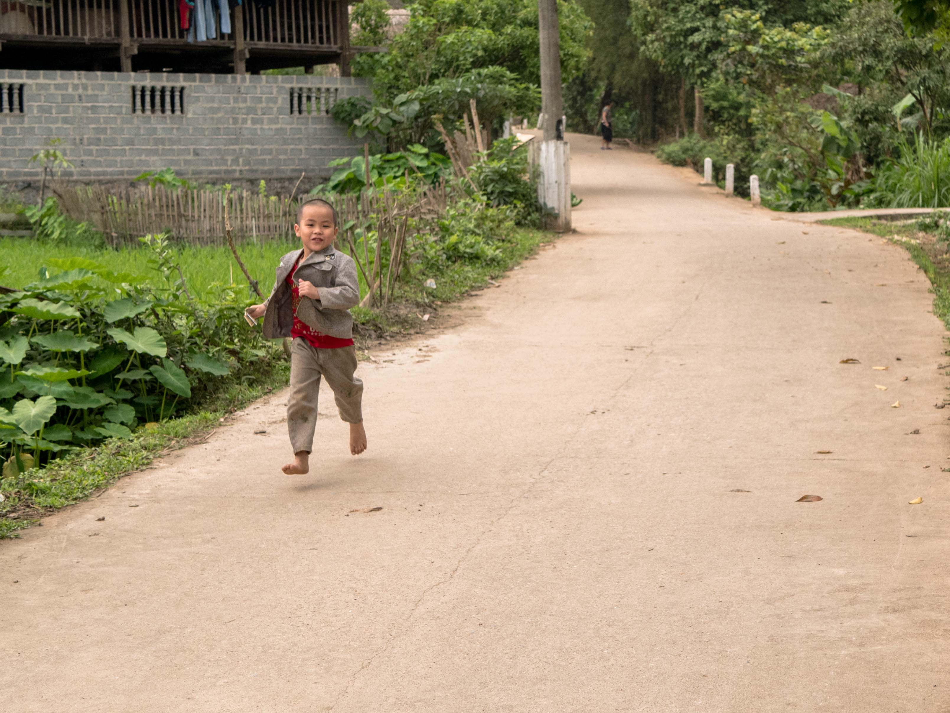 Plus haut des rizières en terrasse remplacent les bassins. Des bœufs sont enfermés dans de petits enclos ressemblant à des maisons de chôme. Les enfants viennent tous me saluer et me demandent comment je m’appellent. Ils m’accompagnent quelques mètres avant de retourner vaquer à leurs occupations.