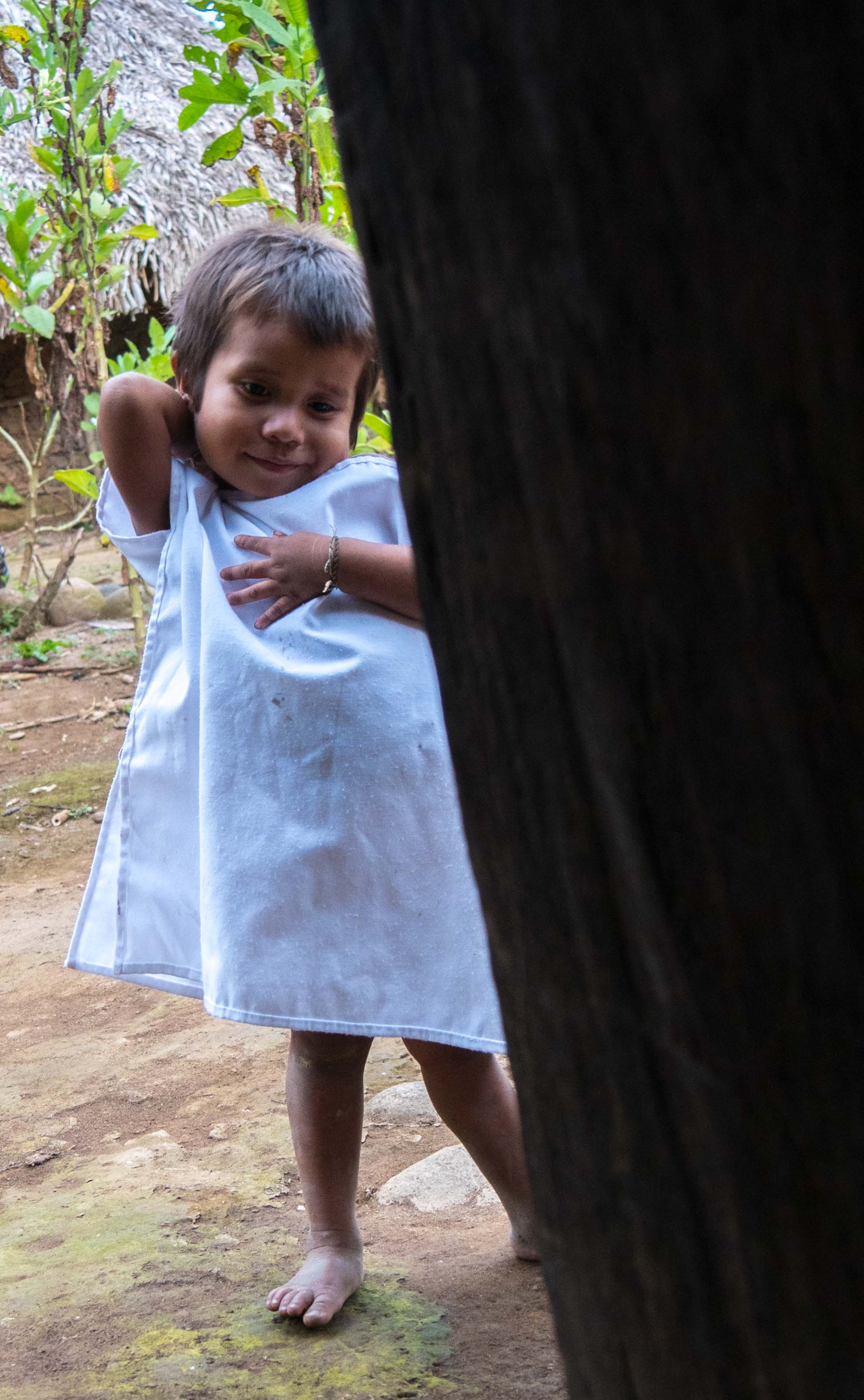 L’homme installe deux hamacs et ressort. Gustavo part vers la rivière se laver et j’en profite pour aller voir les enfants. Ils sont intrigués par mon appareil photo et nous jouons quelques instants sous le regard bienveillant de leur maman.