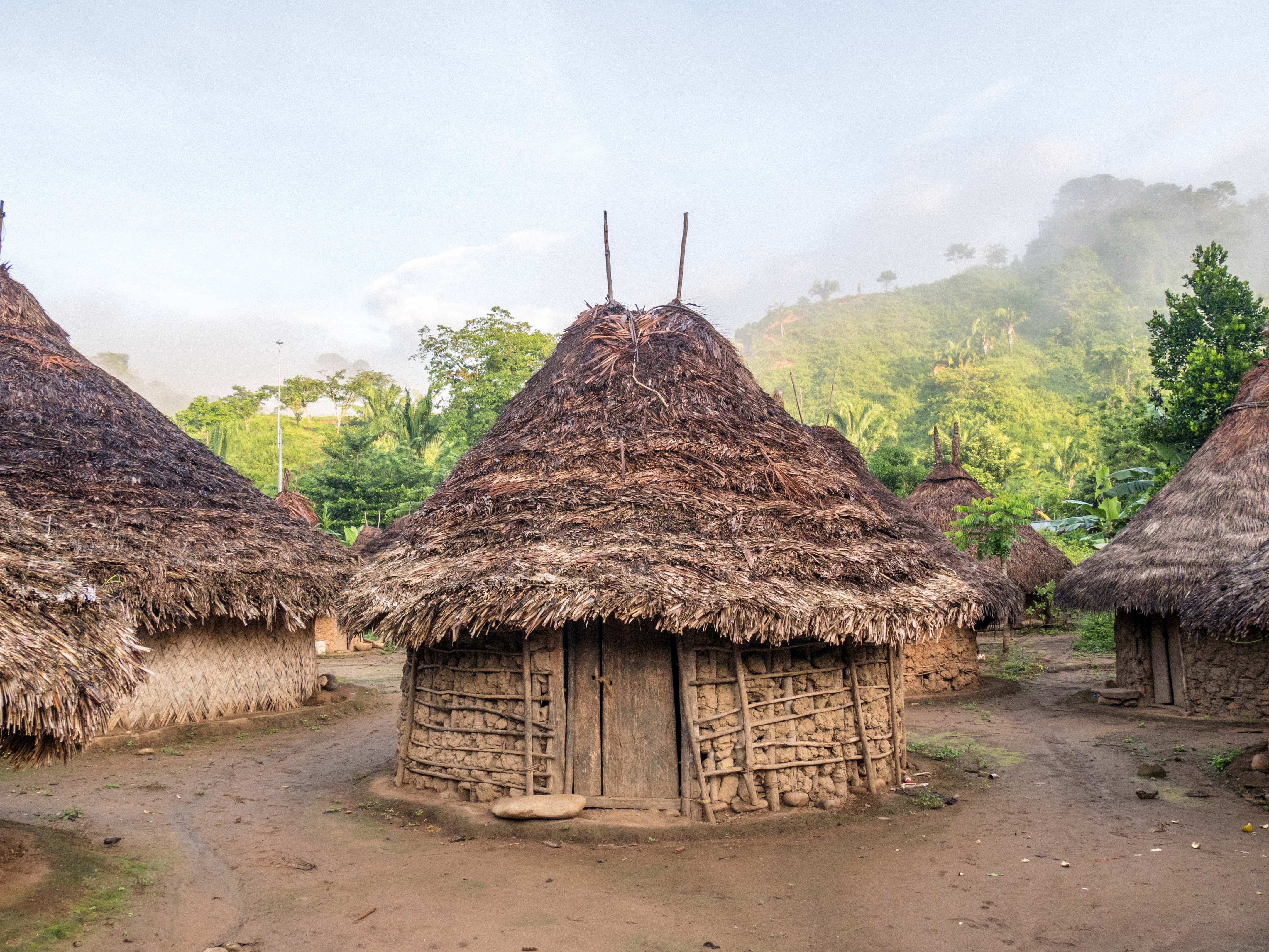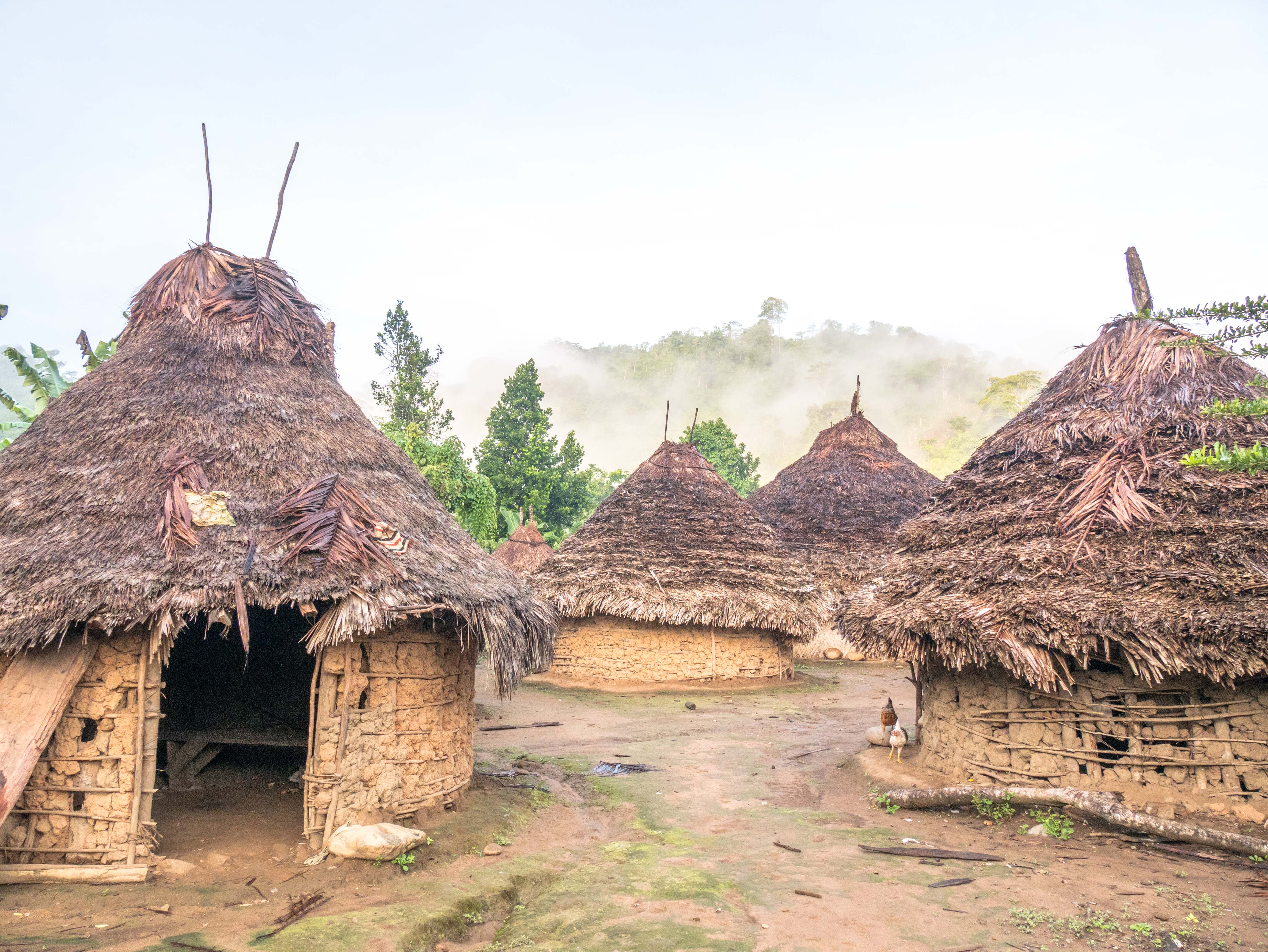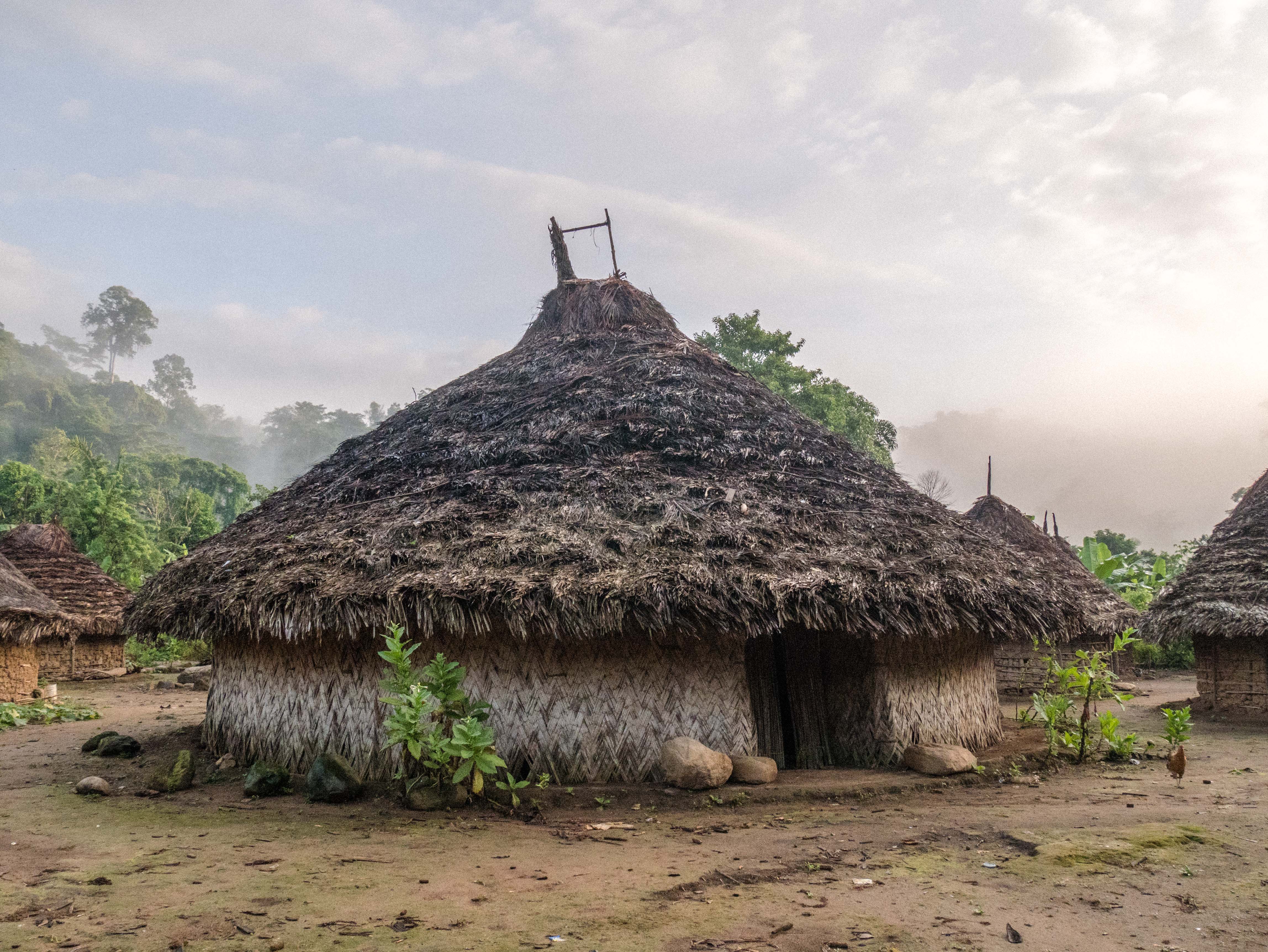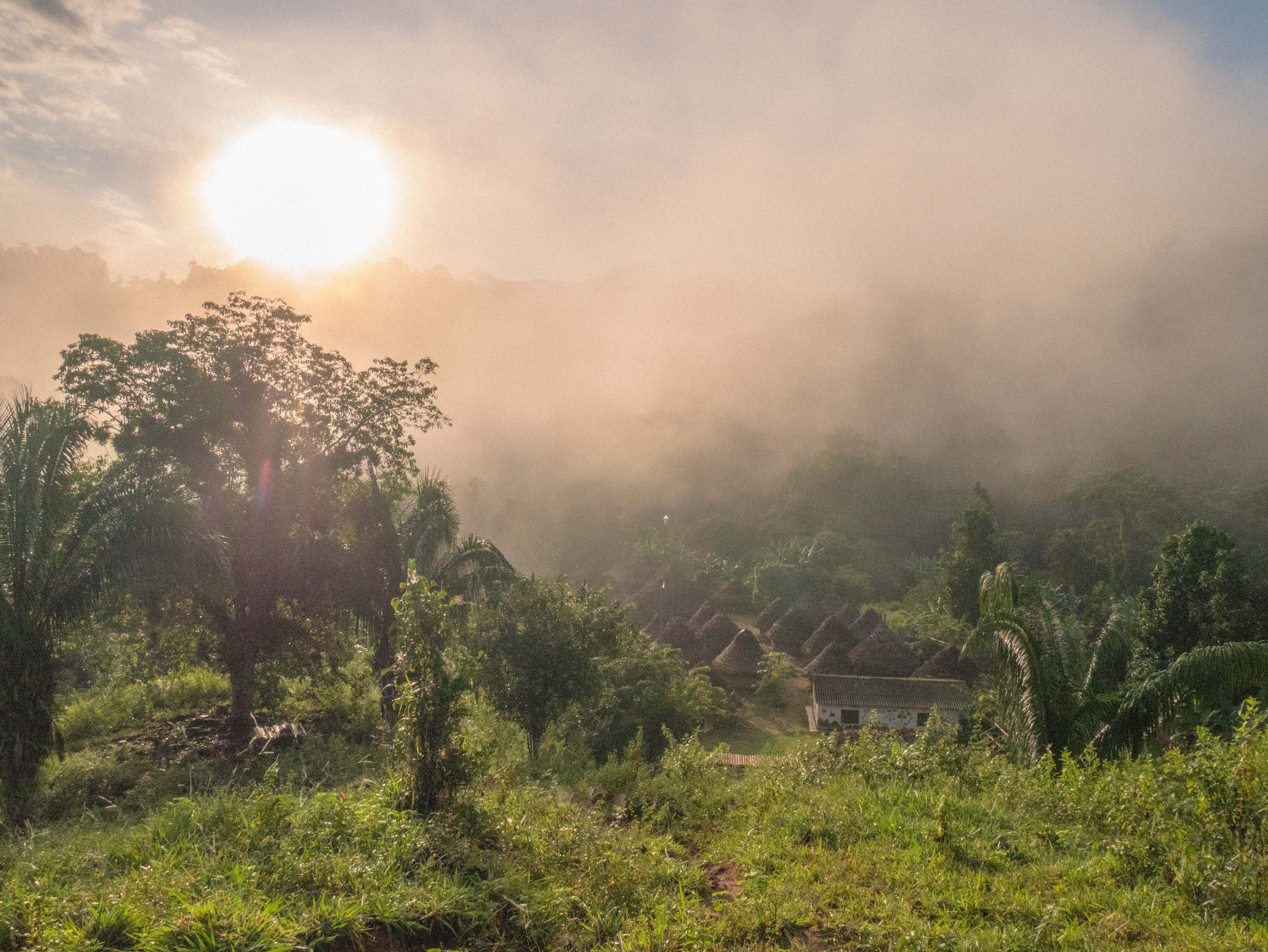 Les enfants sont déjà réveillés et courent dehors. De temps en temps, je peux en apercevoir un s’approcher de la porte de ma hutte pour voir si je suis réveillé. Je me lève. Le soleil aussi. Le village est dans les nuages. L’atmosphère qui y règne est indescriptible. Les huttes sont comme entourées d’un halo blanc découpé dans un ciels aux milles couleurs.