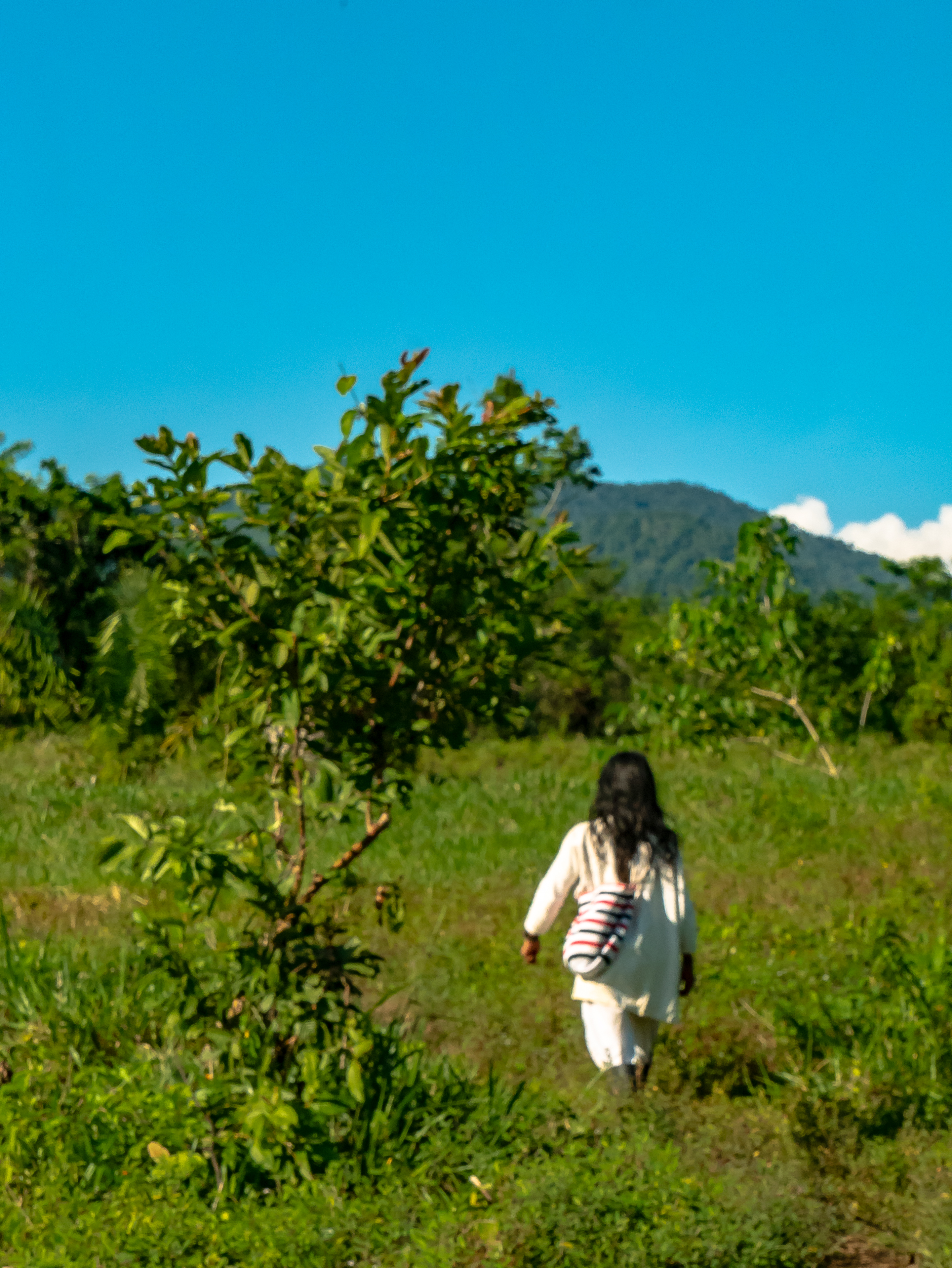 Les paysages sont vraiment différents d’une vallée à l’autre. Alors que la veille nous avons slalomé entre rivières, ruisseaux et jungle dense, aujourd‘hui, nous voyons plus de grands espaces. Nous traversons des champs de hautes herbes dans lesquels pâturent les vaches des Kogis.